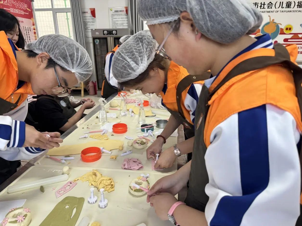 活动伊始,福利院花馍店店长向大家介绍店铺创办历程、助残成果,深情表达对党组织关怀和社会爱心力量的感谢。他提到,花馍店不仅是非遗技艺传承平台,更能通过技能培训帮助残障人士实现就业增收,让志愿者深刻体会到公益事业与传统文化结合的意义。随后,参与者兵分两路开展研学。在花馍制作区,两位指导老师现场演示花馍塑形技巧,讲解植物色素提取工艺与晋派花馍历史。志愿者跟着揉面、调色、捏花,在老师指导下完成寿桃、生肖等造型各异的作品。志愿者用实际行动诠释志愿服务精神,获店主连声称赞。在气球花艺区,老师带领志愿者与义工小朋友合作制作义卖花束。得知作品将用于资助福利院儿童,大家默契配合、创意迸发,很快完成色彩缤纷的气球花束。现场笑声不断,洋溢着“奉献爱心、收获快乐”的温暖氛围。