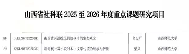 长期重视科研培育,鼓励教师深耕学术、关注地方文化与时代文学发展,从选题打磨到申报推进,给予全方位支持。这两项课题聚焦山西生态观念挖掘与文学传统创新,既贴合学术前沿,又服务地方文化建设与文学发展需求,有望为山西文化研究、文学传承注入新活力,助力讲好山西故事、推动学术创新。