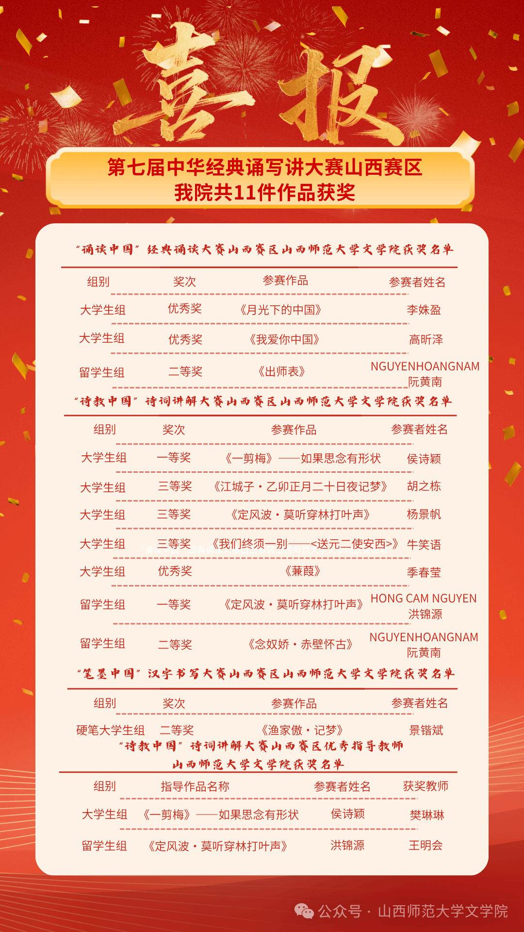 共计两位指导老师被评为“诗教中国”诗词讲解大赛山西赛区优秀指导老师。具体名单如下: