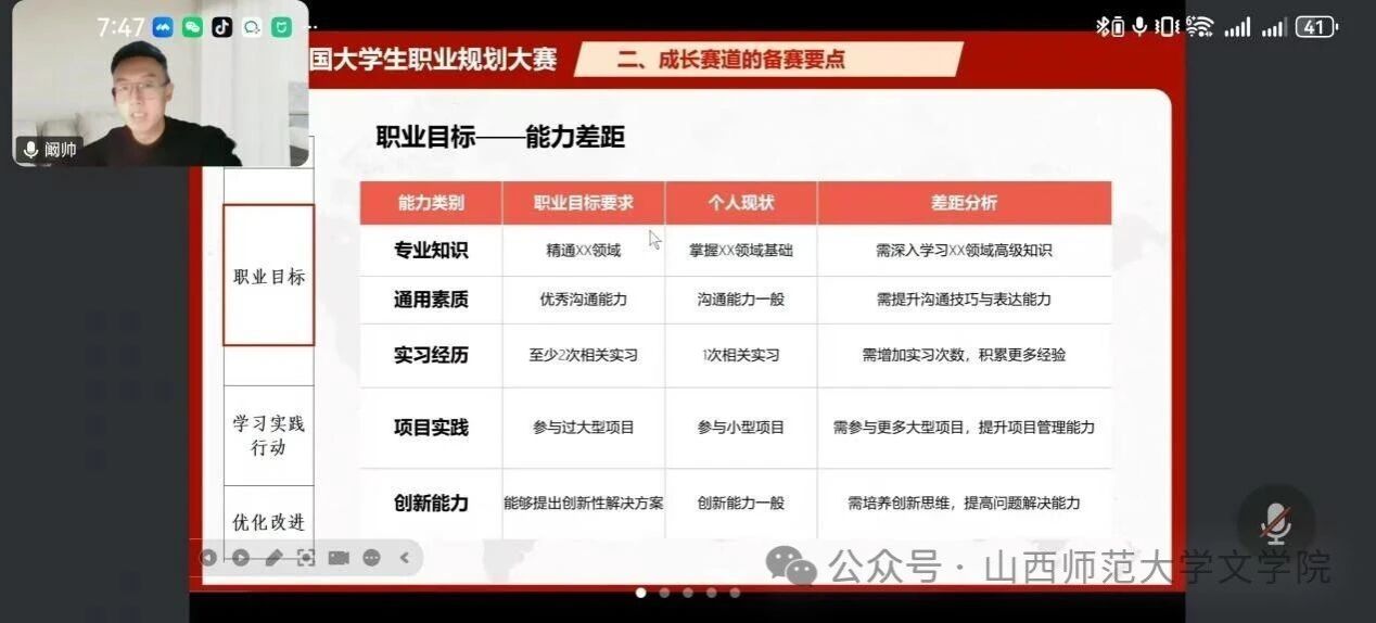 分享会上,阚帅聚焦不同赛道的备赛要点展开讲解,重点拆解了指导不同阶段学生备赛的核心方法。他通过表格清晰地呈现了职业目标对专业知识、通用素质和实习经历等能力类别的具体要求,结合“个人现状”与“差距分析”的对应关系,直观展示了如何更加贴合赛事评分标准,以及如何精准提高学生能力、弥补短板。此外,他结合自身指导学生斩获国赛金银奖的经验,点明职业规划要根据目标确定合理的能力提升路径,建议指导教师从不同维度帮助学生构建清晰的成长框架,培养学生的创新思维。