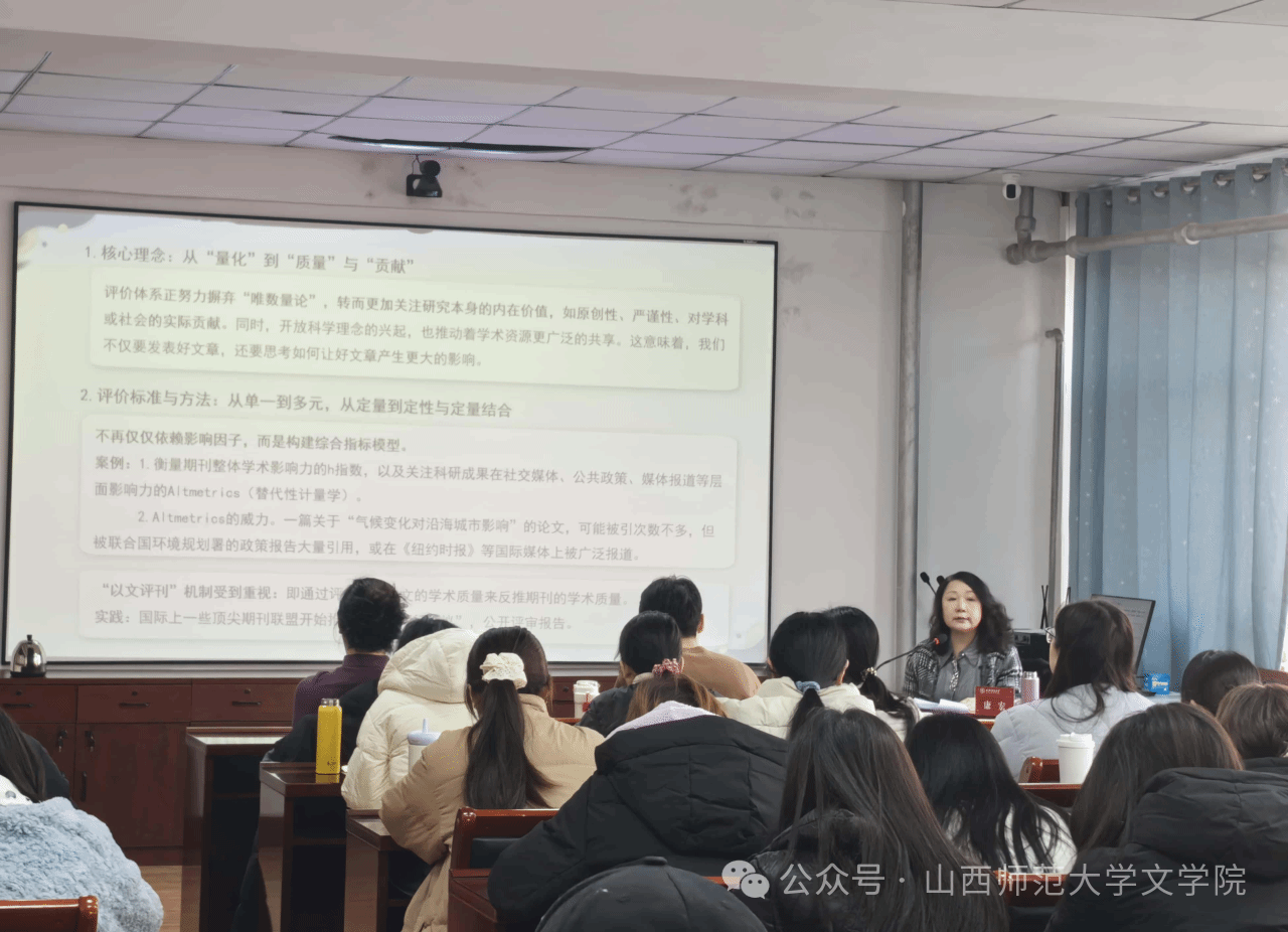 编辑出版学专业特邀山西省期刊协会会长、《编辑之友》杂志社原社长康宏编审举办主题为“学术期刊高质量发展的核心方略:从论文审校到品牌塑造”学术讲座。讲座由索煜祺老师主持,编辑出版专业部分本科生、研究生参加。