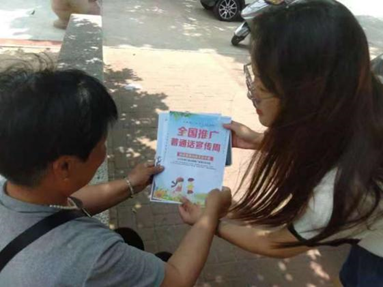 “益启说”推普志愿者向当地居民发放宣传页    “益启说”推普志愿者进行问卷调查