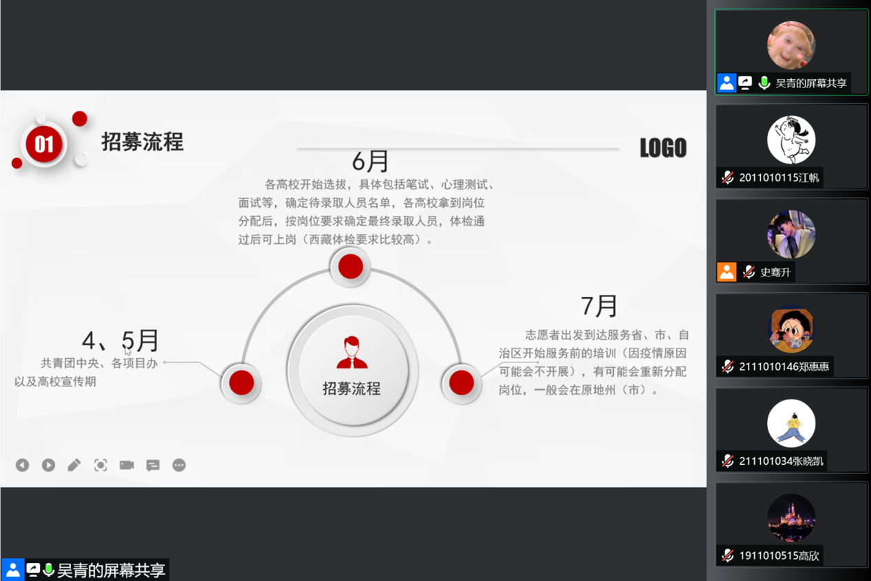 本次经验分享会邀请本院2020届毕业生吴青主讲,在分享会上,吴青重点围绕录取概况、服务情况及优惠政策展开介绍,详细讲解了西部计划录取流程、志愿西部服务工作以及志愿后的就业考研政策。在后续的提问环节中,同学们针对“西部计划”的报考条件、笔试面试内容、培训内容、岗位匹配以及不同岗位的就业环境提出了自己的疑问,吴青结合自身经验对这些问题进行一一解答,解决了同学们的疑惑。