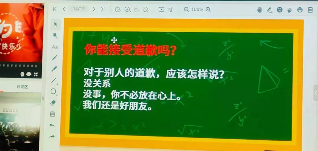 “三个字”“很常用”“很难说出口”“表达歉意”……在这样一道谜语题中,景欣慧引导孩子们进入了本次课堂的主题“学会表达‘对不起’”。孩子们在她的带领下,进行趣味游戏,在情景模拟中积极互动、畅所欲言,潜移默化中得出了道歉三法宝:真诚、恰当的表达艺术和合理的心态。一段舒缓的轻音乐后,景欣慧耐心教导孩子们如何学会道歉并要欣然接受他人的道歉,鼓励孩子们今后学会表达“对不起”,勇于承认自己的错误。